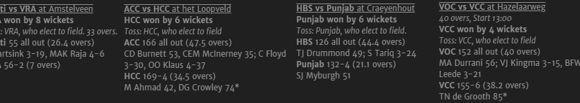 Dosti must surely be happy there´s no relegation this season as its hard to see how VRA could lose from here. Raja ends with utterly ridiculous figures of 4-6 off 6 overs while Luke Hartsink will be giving the selectors something to think about when Gunning is available again, his figures of 3-19 off 7 overs are truly remarkable.