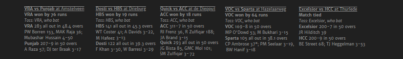 Sparta put up a fight at least, recovering from 44-7 to reach triple figures, Ambrose making a defiant 37* with support from Dost Mohammad, but 169 was always going to be a serious ask at Hazelaarweg and early wickets pretty much sealed the game.