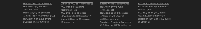 This match turned on eight overs in the Voorburg innings, in the course of which the home side slumped from 82 for two to 94 for seven. There was no way back from there, and although Brandon Glover and Yasir Hamid flourished briefly, Umar Baker’s six-wicket haul was a match-winning effort on a pitch which again made batting very tricky indeed. Glover and Viv Kingma worked hard to achieve an unlikely fightback when Excelsior replied, but with Tim Etman surviving chances and near-chances for a dogged 81 the Schiedammers battled their way to a seven-wicket victory.