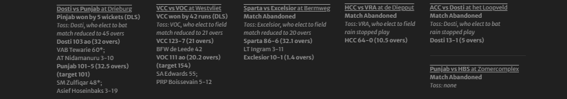 Just not enough runs on the board for Dosti in the end, Vinoo Tewarie’s captain’s knock notwithstanding. Punjab only ever needed one partnership, and they were always likely to find one given the depth of their batting. It was Saqib Zulfiqar who would provide the backbone to an otherwise stumbling chase, and eventually found support in his brother Asad, even if the latter would eventually deny him a much-deserved half-century. Dosti’s early fightback with the ball, led by Asief Hoseinbaks’ uninterrupted spell of 3-19, nonetheless suggests there’s plenty of fight to be found at Drieburg, and it’s hard to see them going winless again this season. Thanks all for joining us today, and do check back later in the week for the reviews, photos and of course the preview for the bumper double round we have coming up next weekend. We’ll be back live on Thursday when HBS take on ACC in the sole Ascension Day game, with the rest of the round being pushed back to Sunday. Until then, this is Bertus de Jong signing off from a surprisingly sunny Sportpark Drieburg.