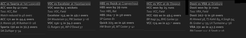 Second innings wickets still entirely confined to Drieburg and Craeyenhot it seems. Sparta 38 without loss after 8.