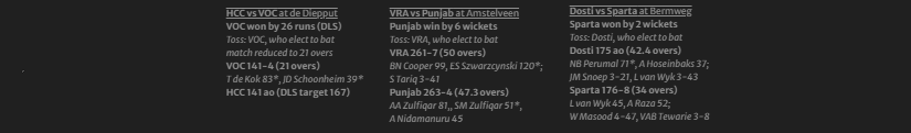 Nagasiva Perumal top-scored with 71, while Joost Martijn Snoep and Lenert vn Wyk had three wickers apiece, for 21 and 43 respectively.